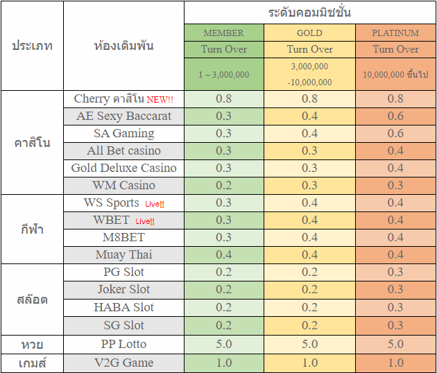 คือ สถานะของกลุ่มสมาชิก ซึ่งสมาชิกทุกท่านจะเริ่มต้นจากการเป็น Member ที่เป็นระดับพื้นฐานของเรา แต่เมื่อใดที่สมาชิกมียอดเดิมพัน ( Turn Over ) ในแต่ละเดือนมากขึ้นตามตารางข้างบน สมาชิกจะถูกอัพเกรดขึ้นไปเป็นระดับ GOLD และสูงสุดคือระดับ Platinum ตามลำดับ และได้รับค่าคอมมิชชั่นที่มากขึ้น การปรับระดับขึ้นหรือลงของสมาชิก จะคิดจากยอดเดิมพัน ( Turn Over ) ภายใน 1 เดือน